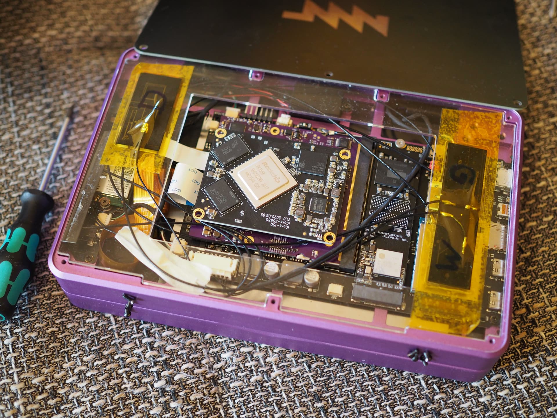 I installed the new headset/switch board 2.0 (the one with the M.2 slot for the wifi+bt) into my pocket and due to the added flat cables and antenna cables it made the mess of cables even worse and harder to manager. I realized that what bugged me most was that the antennas are attached to the display cover so I can never open it up without messing things up and when I close it, I can never be sure whether the cables are where I want them to be because the lid is not see-through like for the classic Reform. So how about not attaching the antennas to the lid at all? Inspired by the small acrylic sheets that MNT offers to attach the antennas to for classic Reform, I created an acrylic shape that fits into the Pocket: