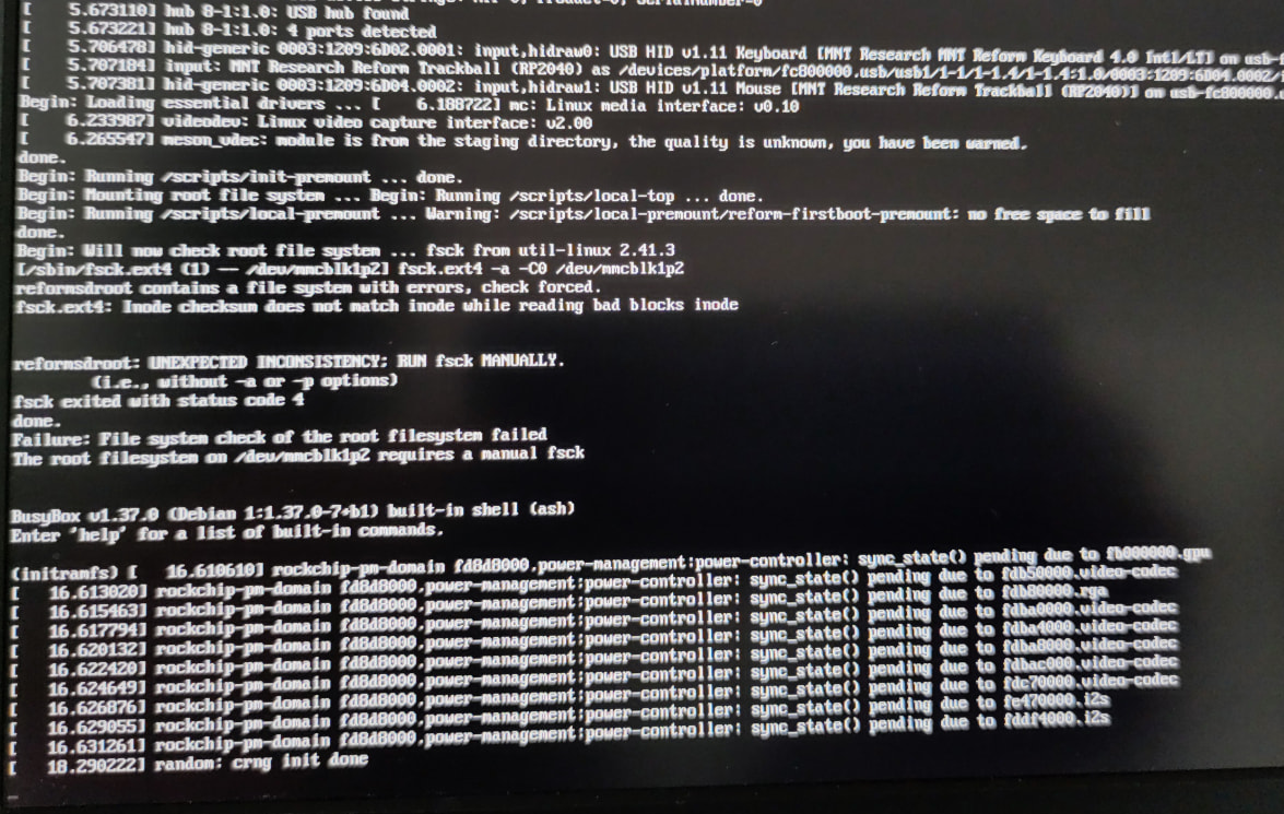 I downloaded the current system image, wrote it to SD, and started the Reform with it. It freezes when booting. Attached is a photo of the messages on the display. I’ll see if I can get the messages another way.