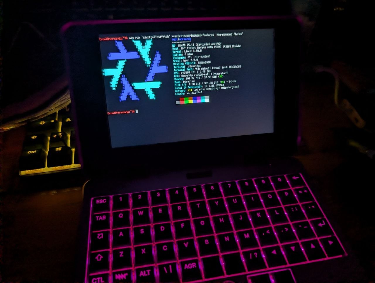 Then I generated the config, created a little flake, added nixos-hardware as an input and the module like nixos-hardware.nixosModules.mnt-reform-rk3588. Then I installed it.