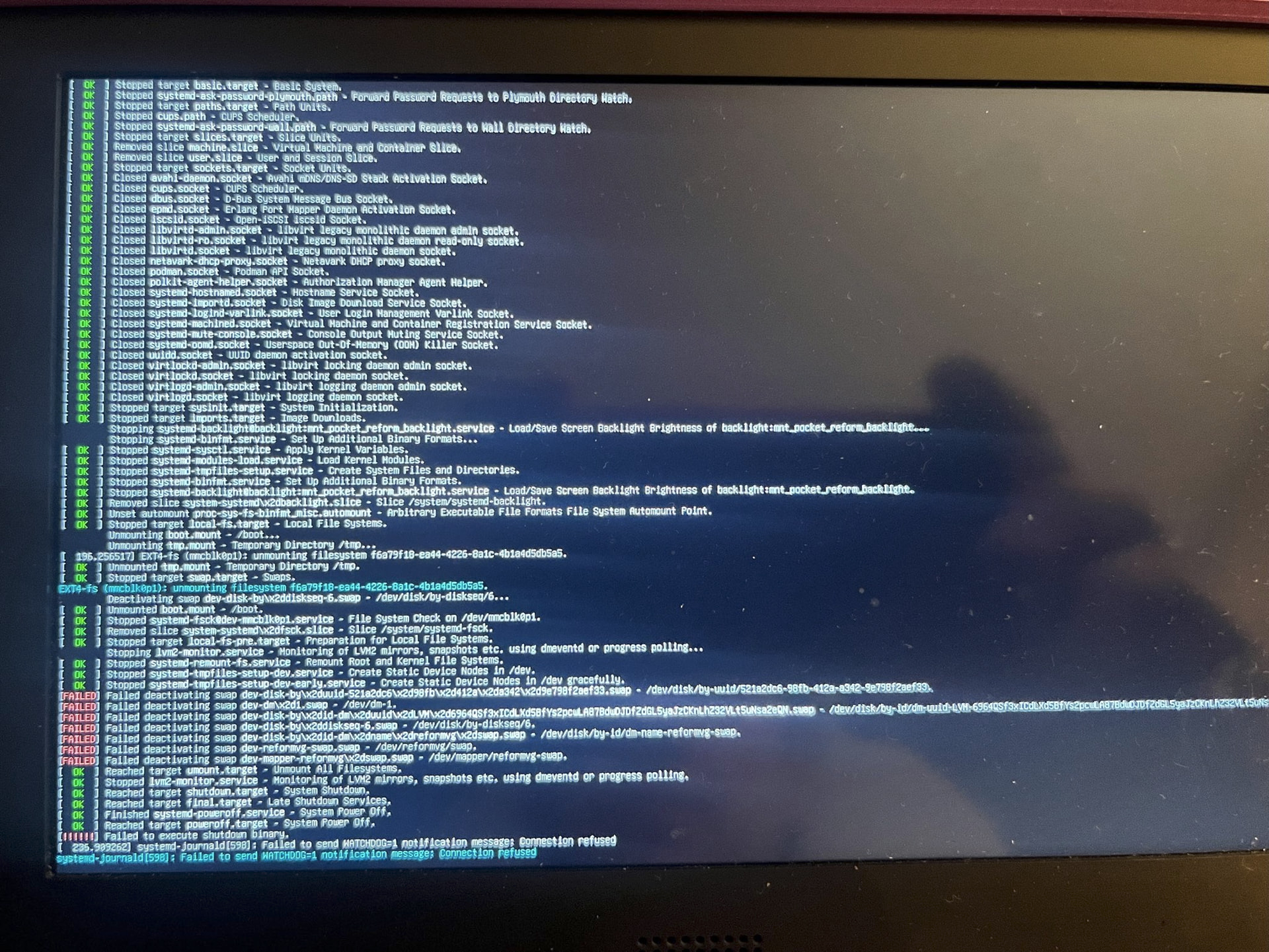 I did try to use dmesg and journalctl to get some ideas about what is going on but I am not experienced enough to know what I should be looking for. There are also errors during boot, see attached - but I am not sure whether this is expected. The systems stops during boot so I can enter the password for the encrypted SSD. Also the screen at shutdown shows some errors.