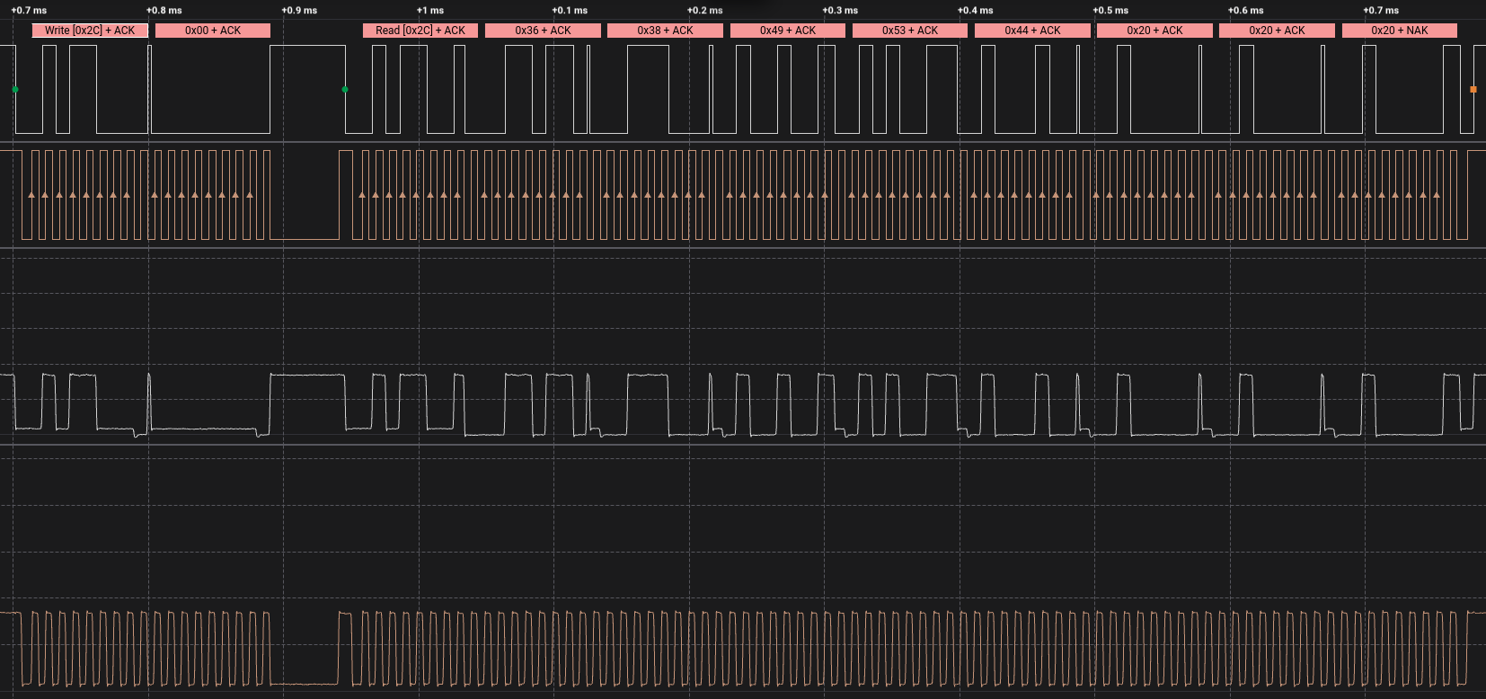 The initial probe over I2C to the bridge is failing. I hooked up a logic analyzer to the I2C lines to investigate, and found this: